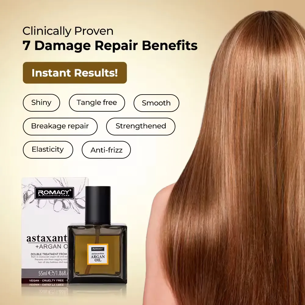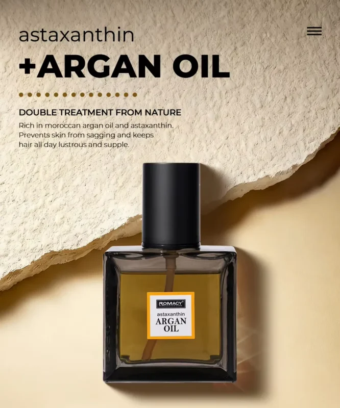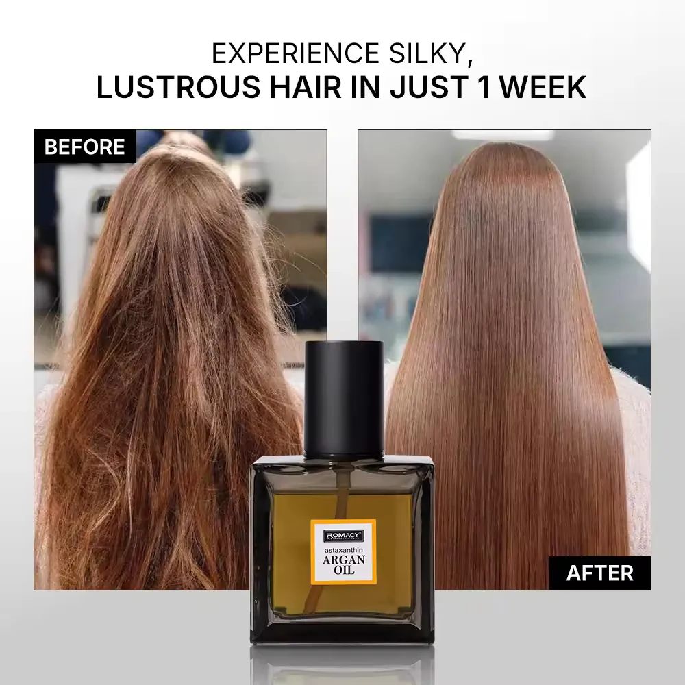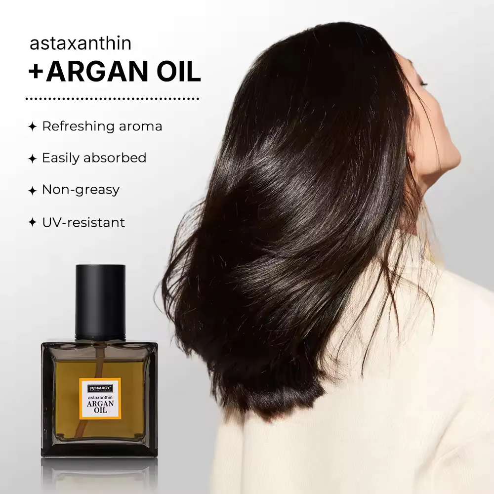 Romacy Salon hair oil Enriched with Argan Oil, Astaxanthin, and Vitamin E, this hair serum deeply hydrates, boosts shine, repairs damaged hair, and protects colored hair. It is a professional-grade daily hair care product, ideal for home use, with customizable volume options and a luxurious brown finish.